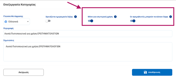 - Χρειάζεται ημερομηνία λήξης: Ενεργοποιήστε την επιλογή, αν απαιτείτε από τον προμηθευτή, να δηλώσει ημερομηνία λήξης για τα έγγραφα που θα ανεβάσει.