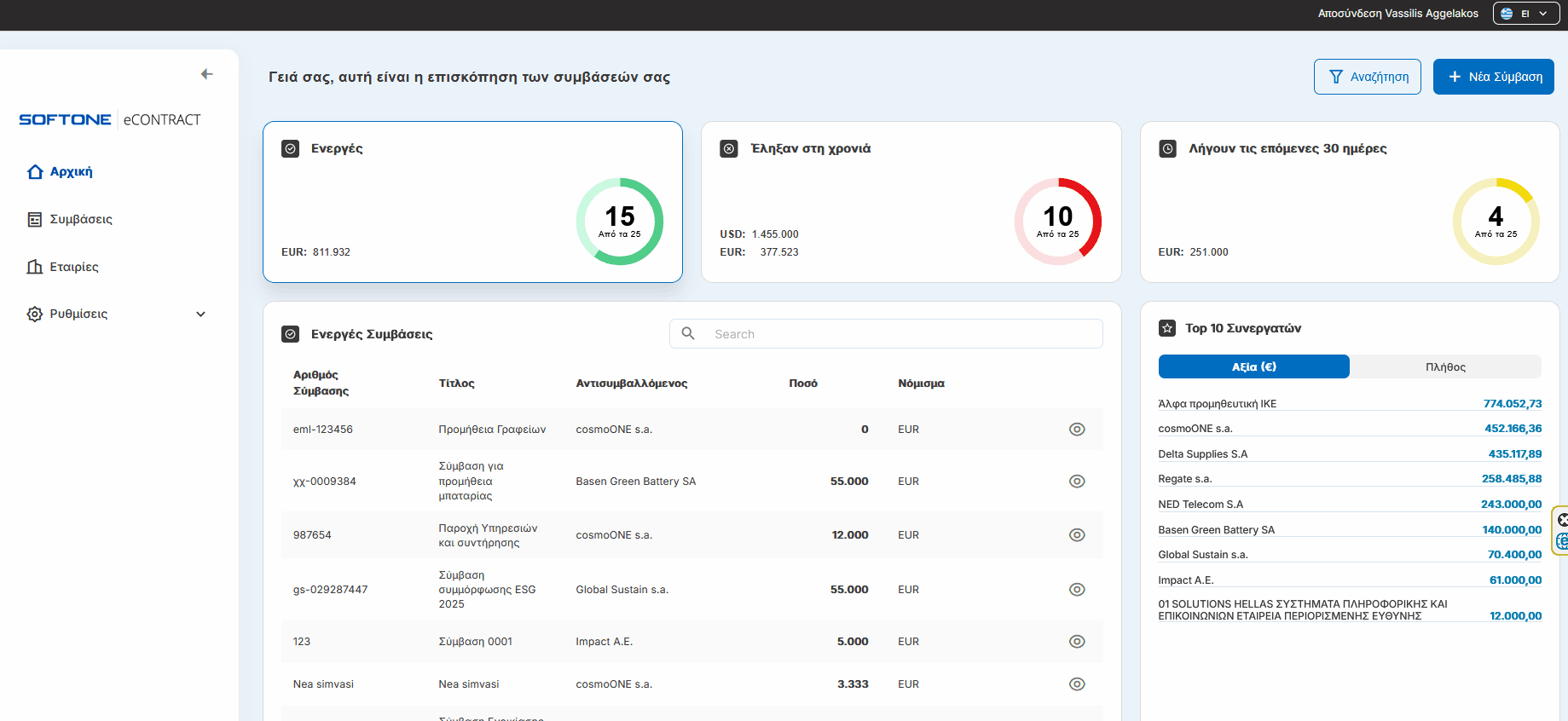 Τα «Tμήματα» της εταιρείας αντιπροσωπεύουν τις οργανωτικές μονάδες που συνθέτουν τη δομή του οργανισμού σας. Η σωστή καταχώριση και διαχείριση των τμημάτων εξασφαλίζει την ακρίβεια στις διαδικασίες ανάθεσης, έγκρισης και παρακολούθησης συμβάσεων. Στην εφαρμογή, έχετε τη δυνατότητα να προσθέσετε νέα τμήματα, να τροποποιήσετε υπάρχοντα ή να διαγράψετε μη χρησιμοποιούμενα, ώστε να προσαρμόζονται στις ανάγκες του οργανισμού σας.