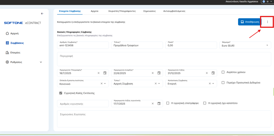 4. Για να εκτυπώσετε ή να διαγράψετε τη σύμβαση, επιλέξτε το εικονίδιο με τις τρεις κάθετες τελείες στην επάνω δεξιά πλευρά της καρτέλας (δείτε την παρακάτω εικόνα).