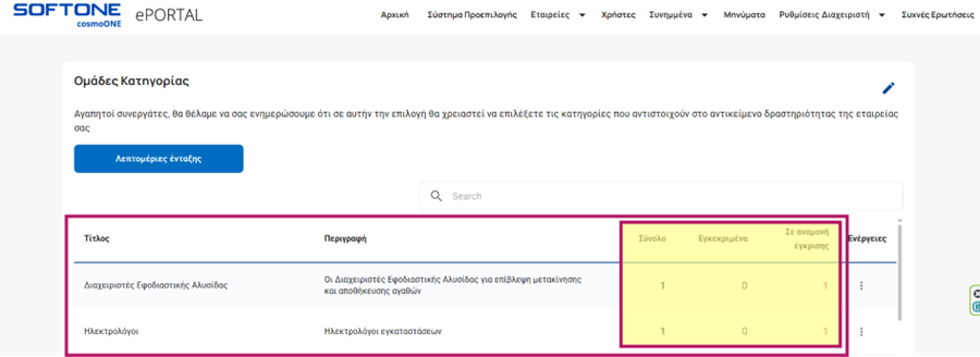 Στον πίνακα εμφανίζονται οι ομάδες κατηγορίας και η κατάσταση των αιτήσεων ένταξης των προμηθευτών ανά κατηγορία. Η κατάσταση των αιτήσεων αναλύεται σε τρεις διαφορετικές στήλες όπου εμφανίζεται το σύνολο των αιτήσεων, πόσες είναι εγκεκριμένες και πόσες σε αναμονή έγκρισης.
